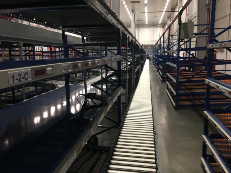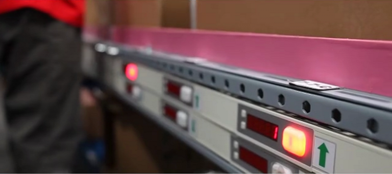 根据出货频率,电子标签与库位的对应有两种方式:A、B类采用1对1模式和C类采用1对多模式。系统下发出货任务,首工位扫描订单号,系统打印箱标贴并提示纸箱类型,作业人员拿取指定类型的空纸箱,把箱标贴粘在空纸箱外侧,推入拣选作业线体。物流箱随输送线到达各通道,拣货工人扫描物流箱的装箱标签,箱号标签点亮,同时该订单所包含的商品对应储位上的电子标签亮起,工人根据标签上显示的数字进行拣货,本区域拣完,将物流箱放到输送线上,它会自动滚动到下一个工位,其他工位作业人员重复上述过程,继续拣货。直到这张订单对应的商品全部拣完,物流箱滚动到复核区进行出货前的检查,最后称重打包出货。整个拣货过程井然有序,真正做到高速度、高效率、低出错率。